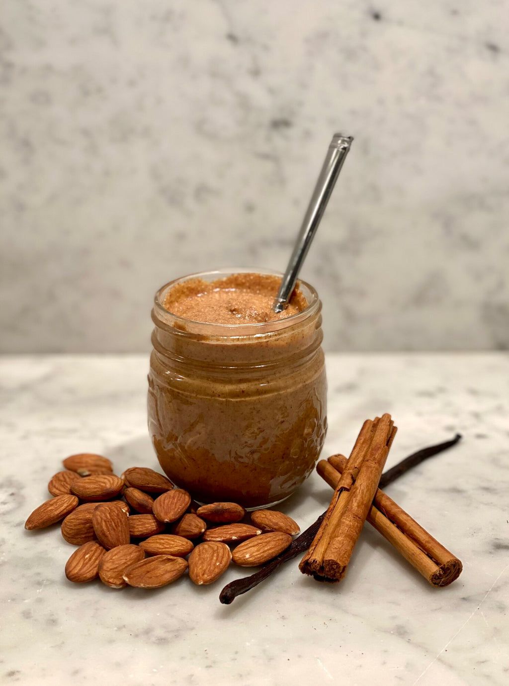 Scattered around are lightly toasted almonds, adding warmth and texture to the scene. A small ceramic spoon holds a generous scoop of the spread, showcasing its glossy finish and inviting richness. In the background, soft linen napkins and a faint sprig of lavender add a touch of artisanal charm. The lighting is warm and natural, casting gentle highlights across the jar and ingredients, evoking a sense of purity and handcrafted quality. This alt text captures the visual essence of a premium, small-batch nut butter made with real vanilla and roasted almonds—perfect for breakfast spreads, baking, or indulgent snacking.